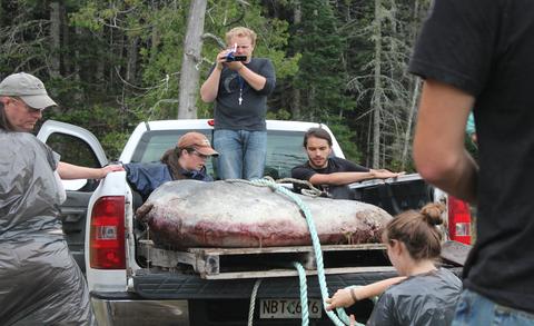 Tracey Dean, the education director at the Huntsman Marine Science Centre (HMSC), and myself drove down to see the fish in the afternoon. Lou Van Guelpen, the Curator of Fishes at the Atlantic Reference Centre, was on-site taking measurements. He estimated the fish to weigh 350 lbs.