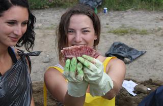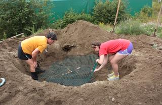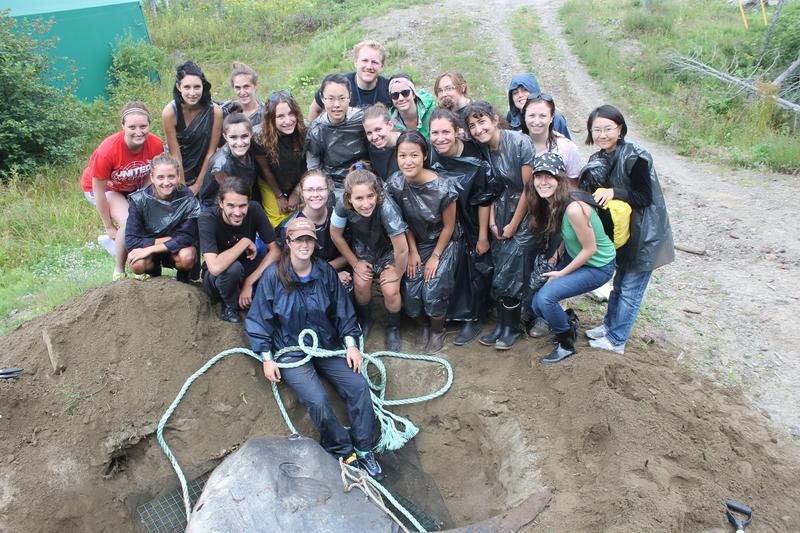 The next morning, August 20th 2013, at 8:30am, the fish was moved onto the back of an HMSC truck, and transported to the moose pasture behind the HMSC facilities. With much effort, the fish and pallet were pushed and pulled off the truck into the hole dug into the sand by the students.