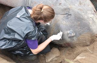 We then made observations about the external appearance, namely the leathery skin which was beginning to decompose. We took samples of the sea lice living on the skin’s surface. Then we began the internal measurements, with each team doing it’s part.